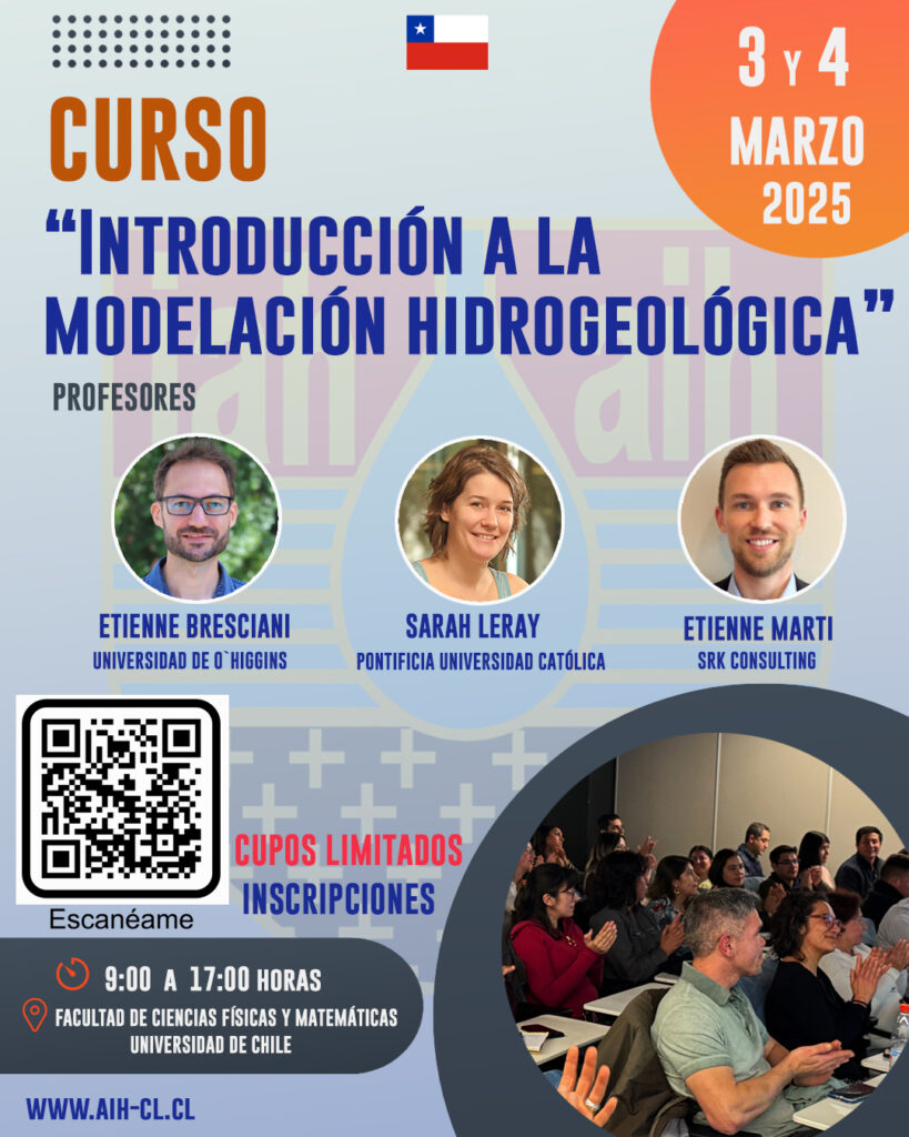 La Asociación Internacional de Hidrogeólogos, Capítulo Chileno, invita a profesionales y estudiantes a participar del curso “Introducción a la modelación hidrogeológica”, un evento intensivo de dos días que se realizará el próximo 3 y 4 de marzo de 2025 de 9:00 a 17:00 horas, en la Facultad de Ciencias Físicas y Matemáticas de la Universidad de Chile.