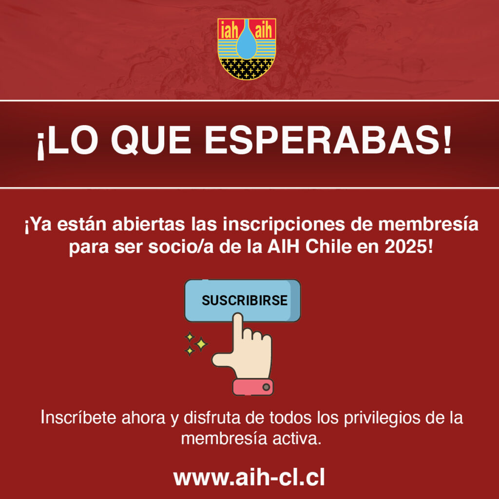 La Asociación Internacional de Hidrogeólogos -AIH-, capítulo chileno, anuncia la apertura de las inscripciones para nuevas membresías, con vigencia desde enero hasta diciembre de 2025. Esta es tu oportunidad de formar parte de una comunidad de profesionales apasionados por la hidrogeología.