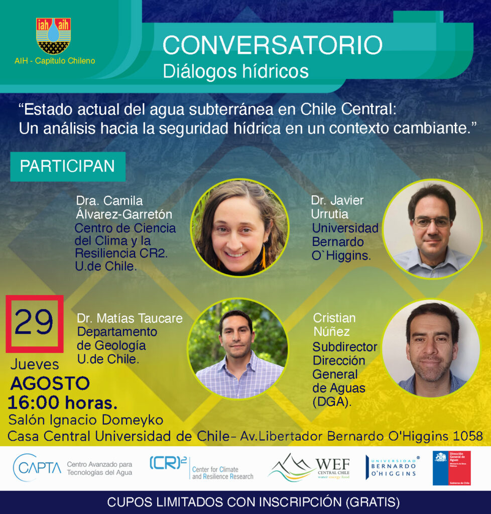 Expositores: Dra. Camila Álvarez-Garretón (CR2 de la Universidad de Chile), Cristian Núñez (Subdirector (DGA), Dr. Matías Taucare (U. de Chile), Dr. Javier Urrutia (Universidad Bernardo O´Higgins)